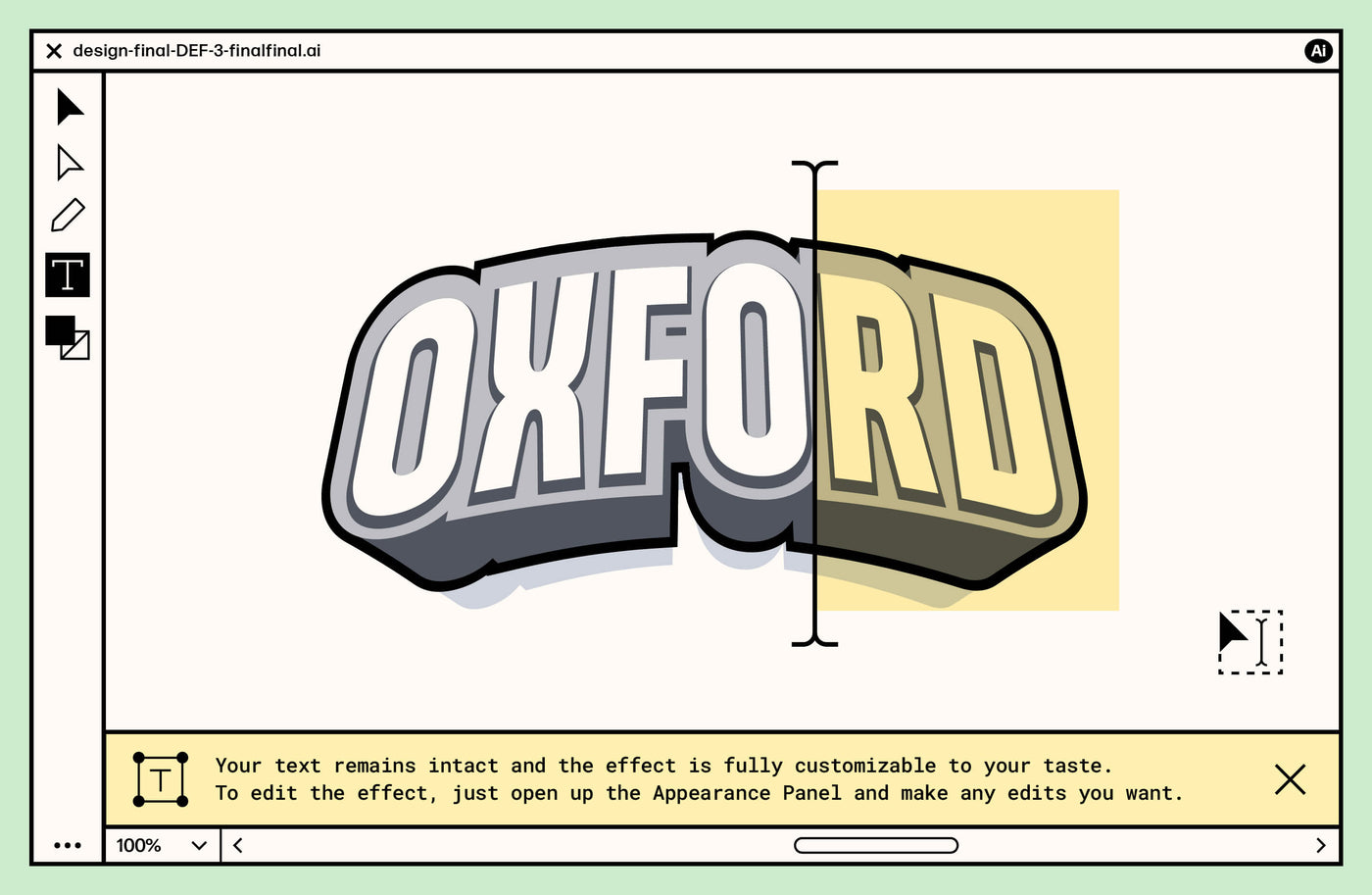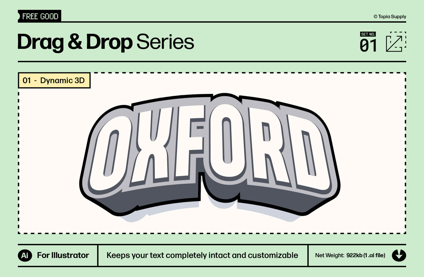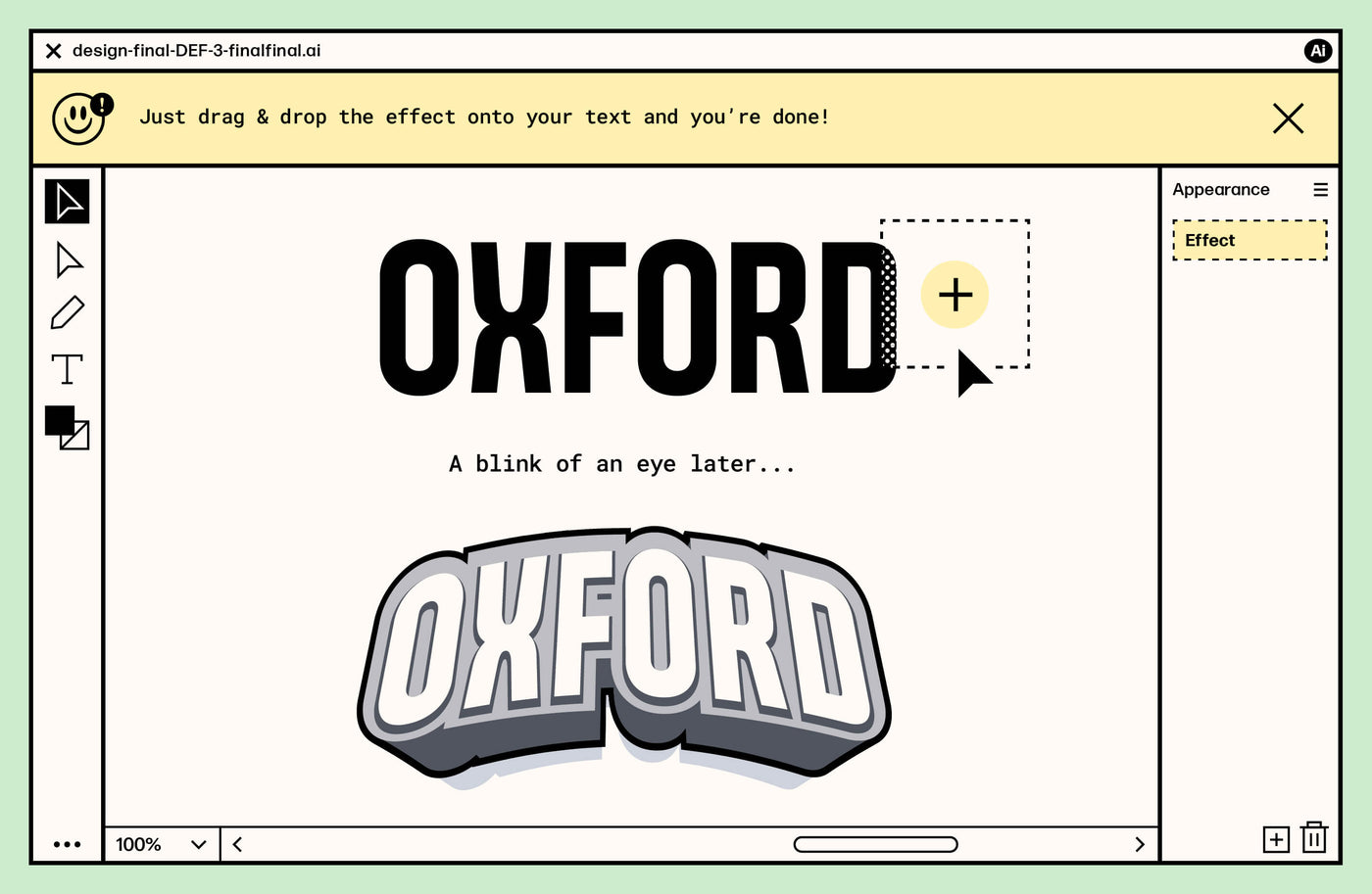 Each effect comes with its own work file for Adobe Illustrator that lets you either drag & drop the effect onto your own text, copy + paste the text sample from the work file, or simply apply it as a Graphic Style. That it only took one second to make will be our secret. Because that’s what friends do.
