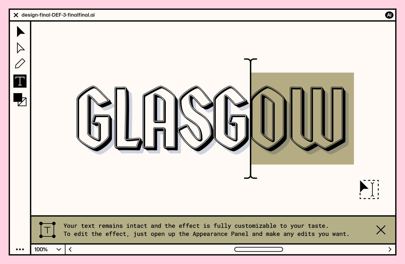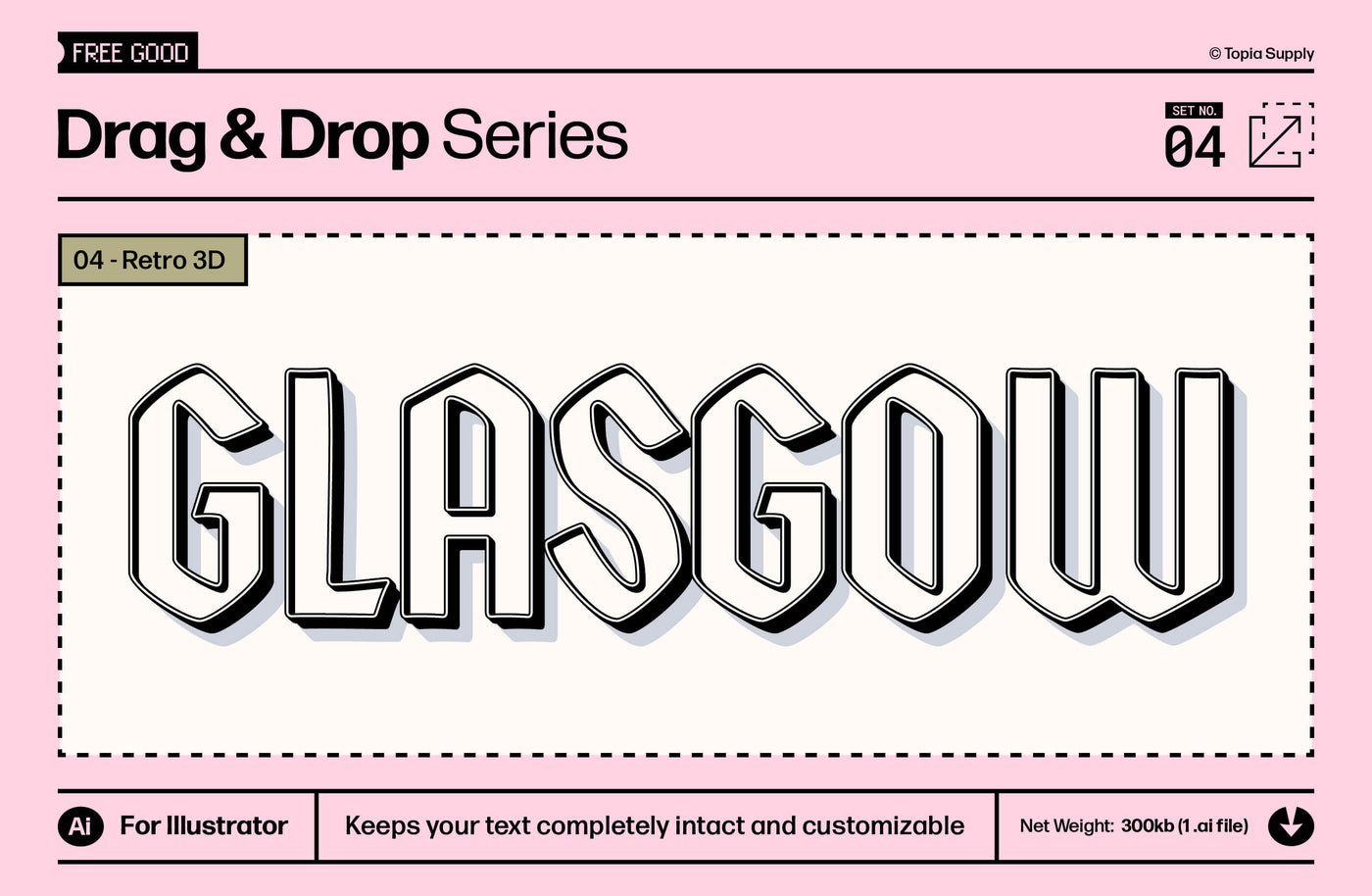Each effect comes with its own work file for Adobe Illustrator that lets you either drag & drop the effect onto your own text, copy + paste the text sample from the work file, or simply apply it as a Graphic Style. That it only took one second to make will be our secret. Because that’s what friends do.