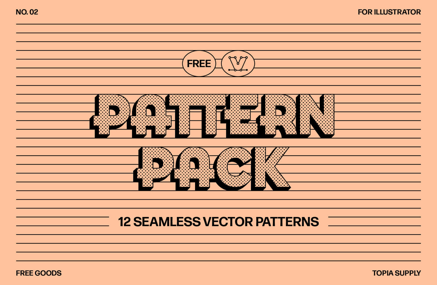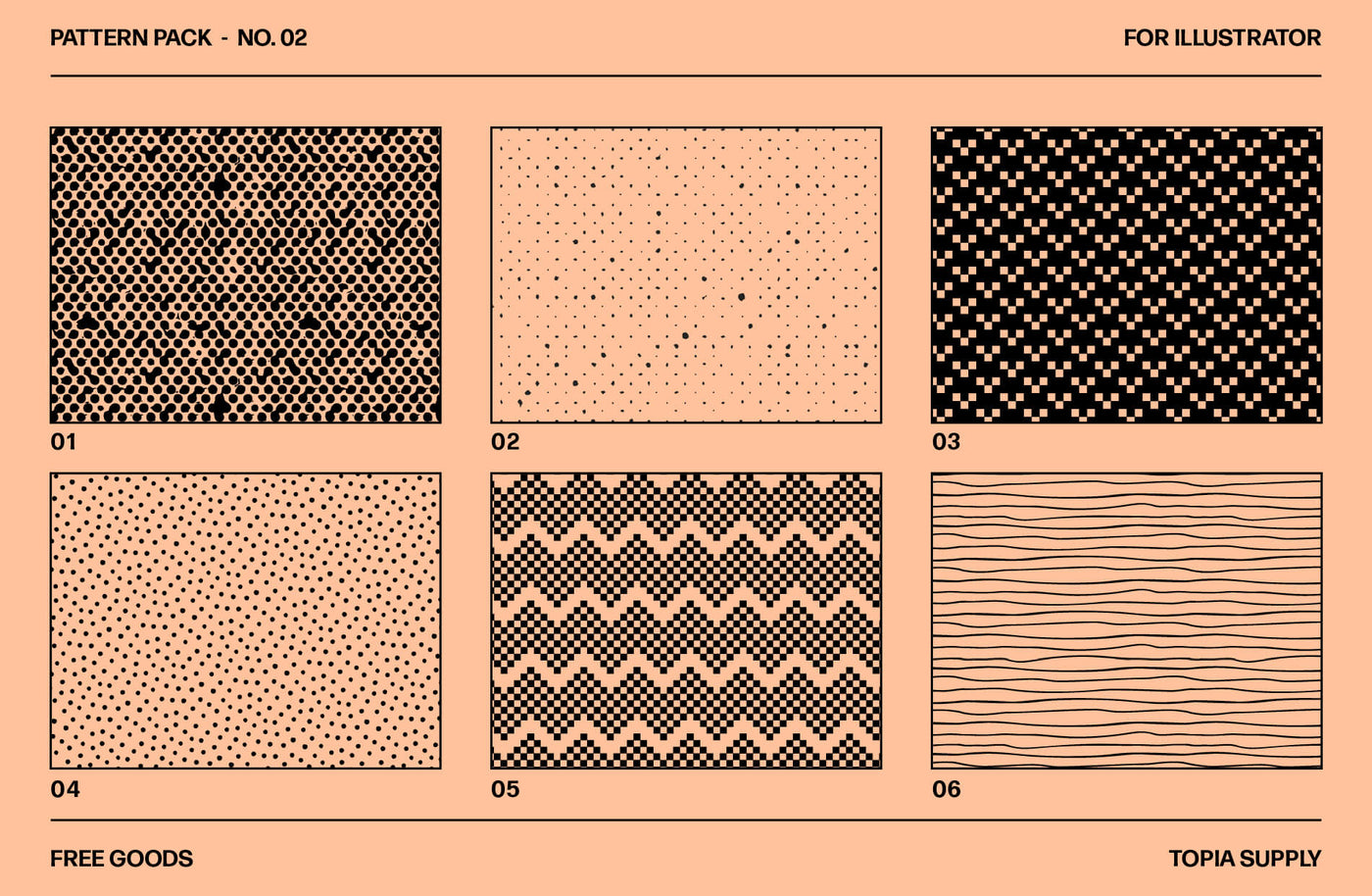 Meet the Pattern Pack, a set of 12 seamless vector patterns for Illustrator, with a variety of styles to choose from. Either use the Eyedropper tool to apply the pattern or select from your Swatches panel. Double-click the Pattern tile or drag it onto your artboard to edit to your needs, like changing stroke widths or forms.