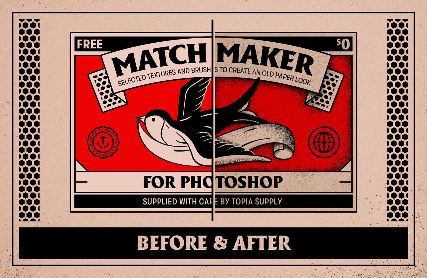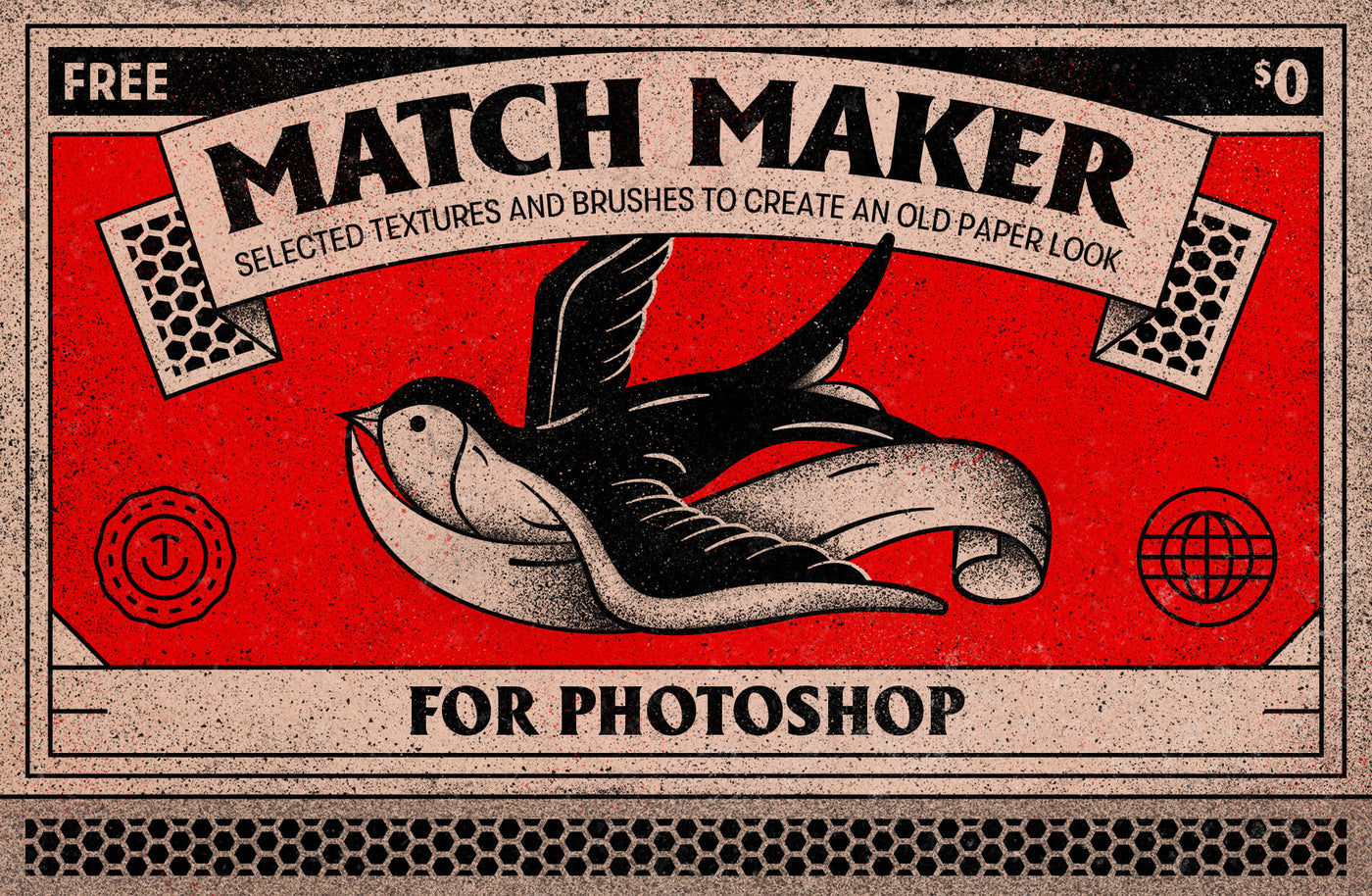 Selected textures and brushes to create an old paper look, including 6 paper textures and 6 texture brushes. With a variety of subtle to heavy brushes and textures, you’ll recreate that authentic look of old matchbooks within minutes.