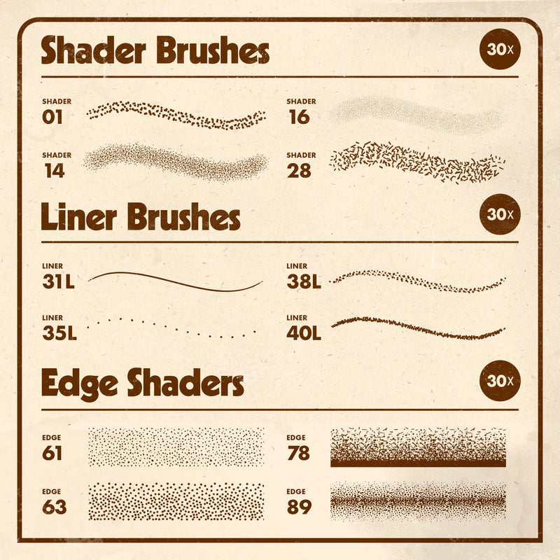 For those who love to keep it vector at all times, the Stipple Kit provides you with all the perks of your favorite software tool while maintaining an analog look. It’s built with professional illustrators and is based on their feedback on how stippling brushes should work. Create outlines with our Liner Brushes that come in 3 different lengths to avoid overdone stretching and maintain a natural look. And with our Shader Brushes and Edge Shaders, you’ll give your artwork the quality of shading it deserves.